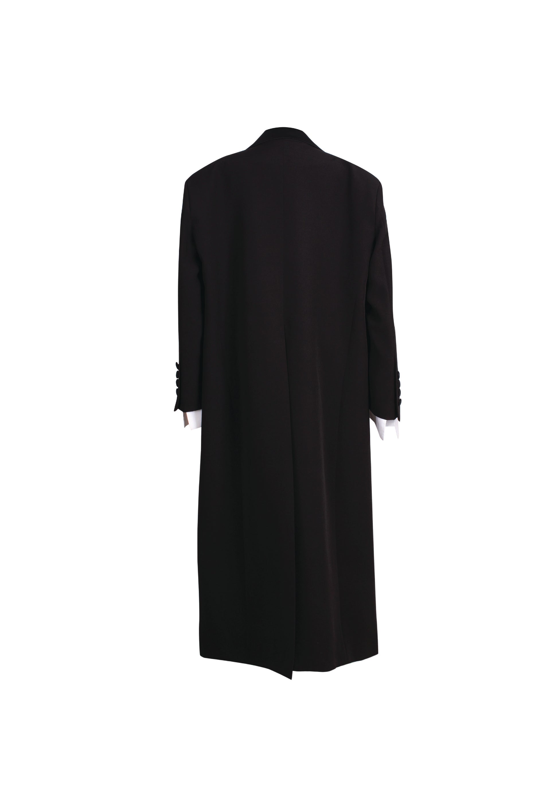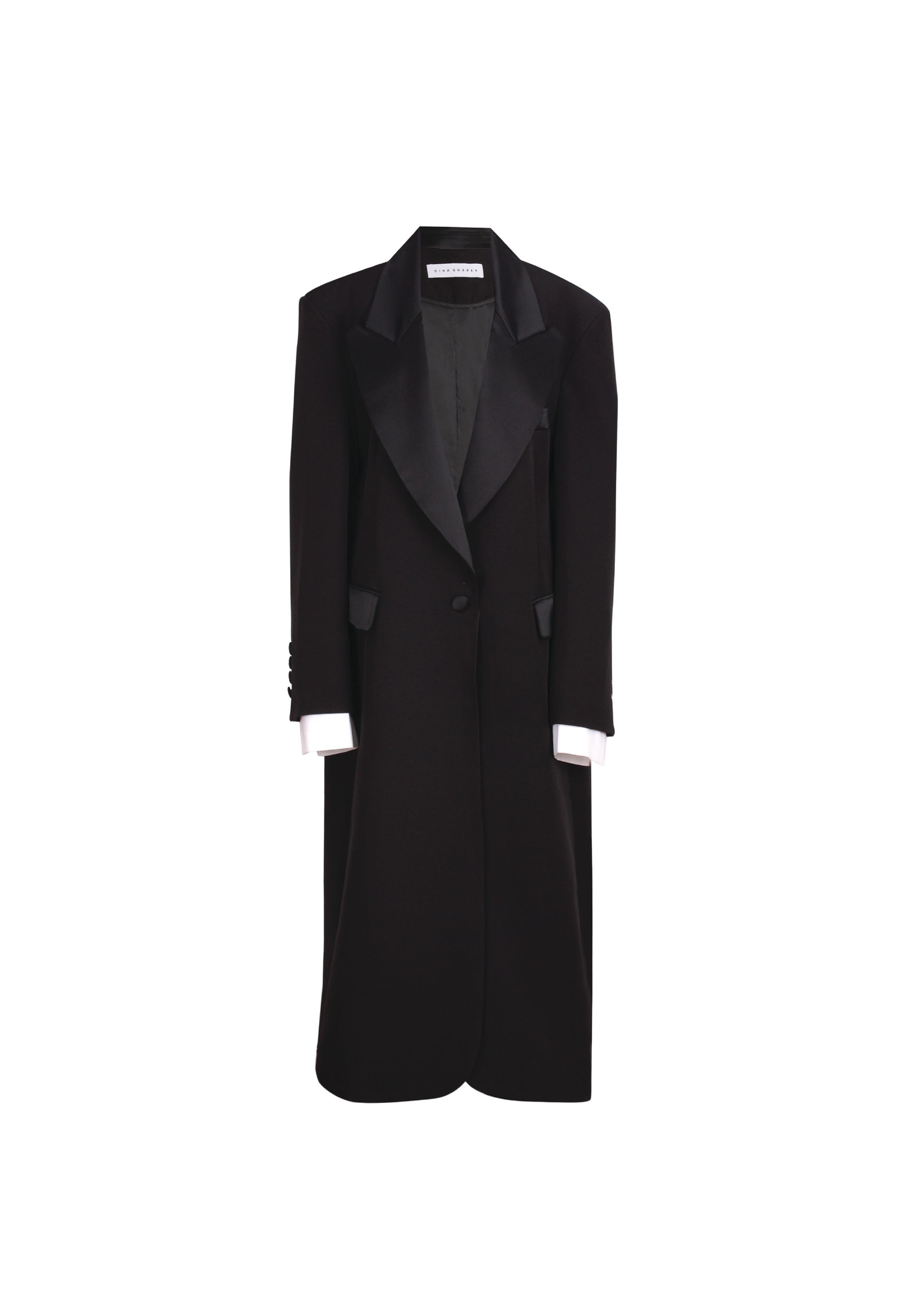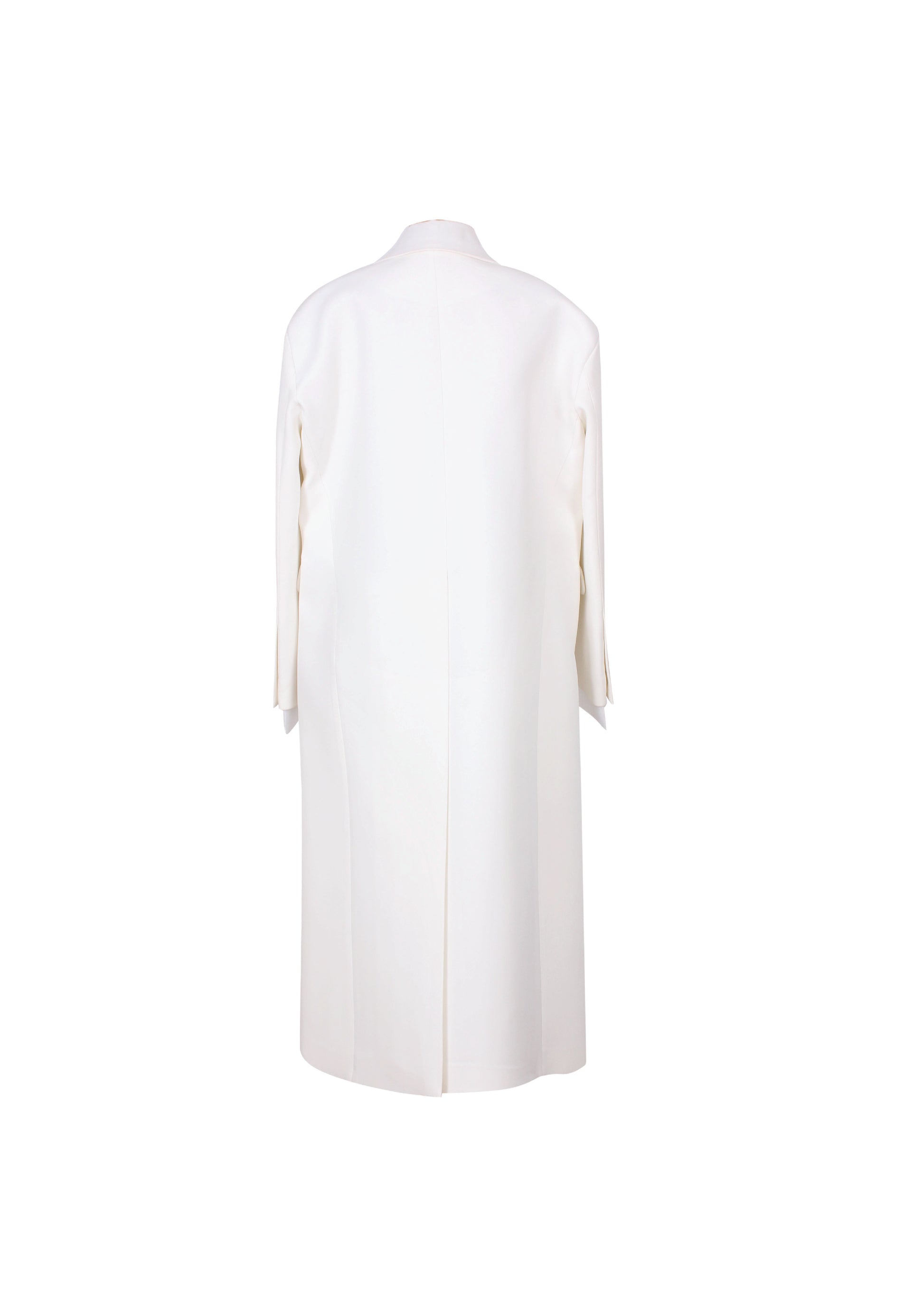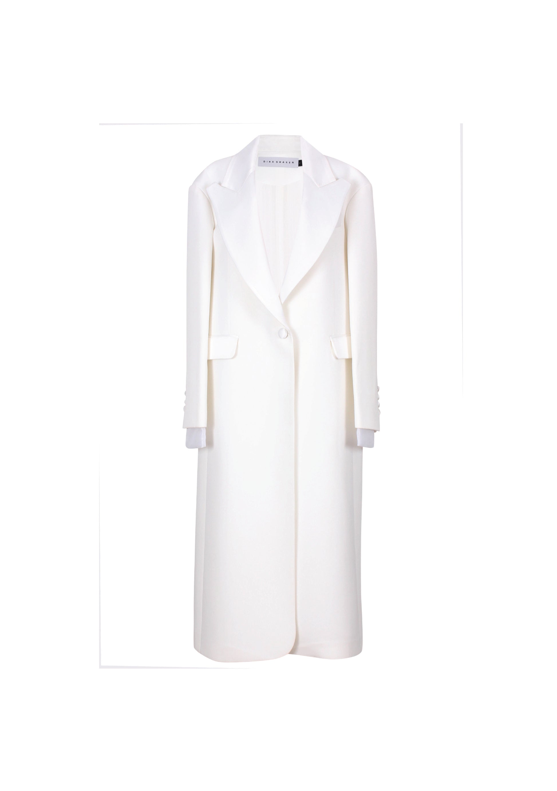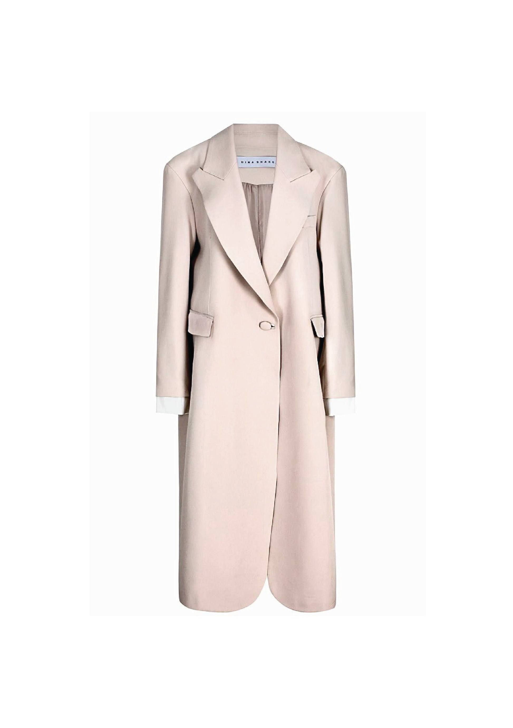 This oversized, single-breasted coat is designed for an extremely relaxed fit, featuring oversized shoulders and shoulder pad inserts for a striking silhouette. Crafted from our signature bonded crepe fabric, it boasts deconstructed peak lapels and a minimalist front button fastening. Fully lined with 100% poly silk for added comfort, the structured construction falls to mid-calf and includes a long back slit for ease of movement. Additional details include long sleeves with buttoned cuffs, a chest slit pocket, and two front flap pockets. Care instructions recommend dry cleaning. Available in black, latte, and white. Made in Egypt.