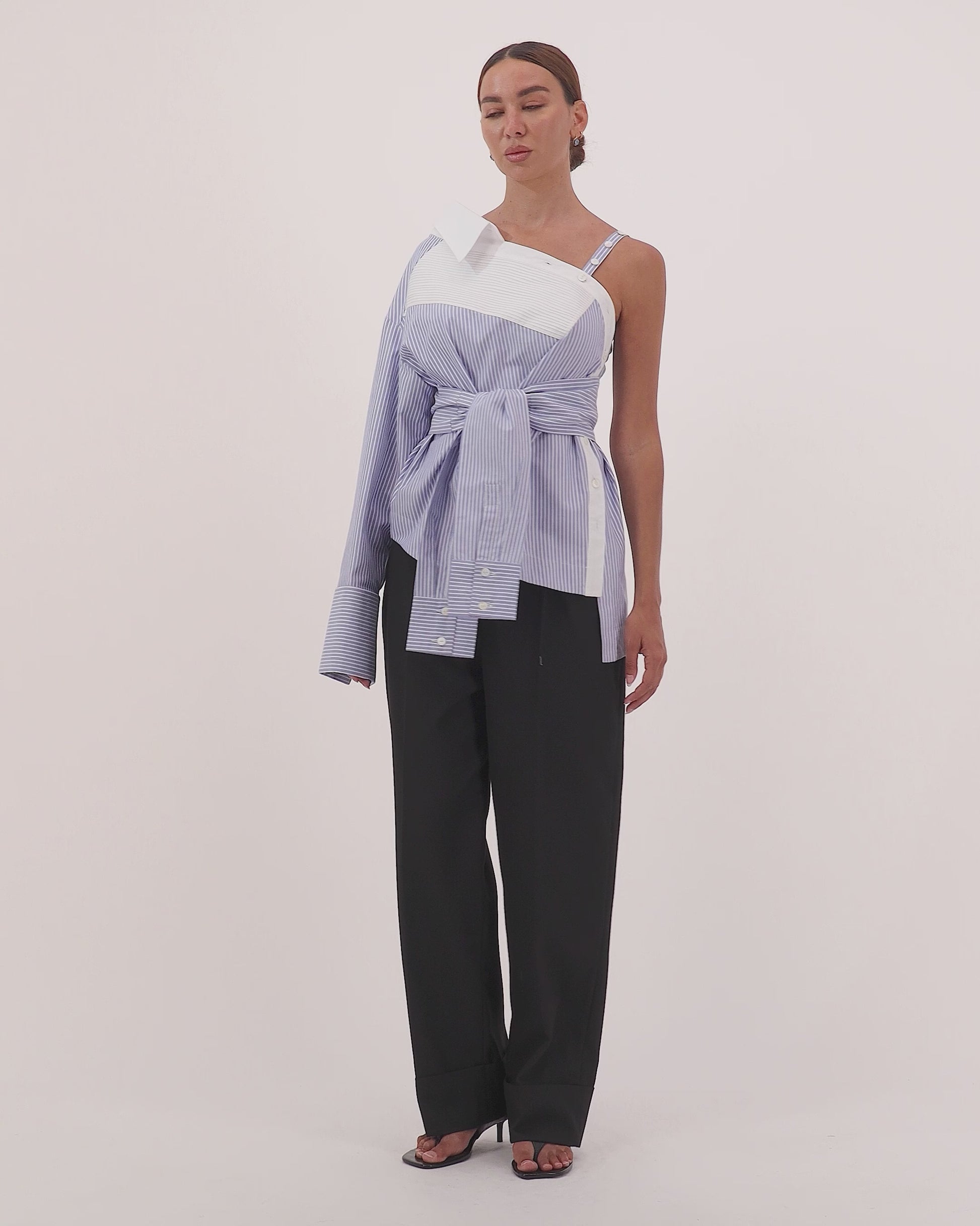Indulge in the luxury of our Deconstructed One Sleeve Shirt. This hand-crafted piece features a unique one shoulder design, tuxedo pleats on a white bib, an asymmetrical hemline, and a side button closure for an effortlessly chic look. It also features a mock sleeve belt . Made from 100% Egyptian cotton , this shirt boasts an exclusive quality that will be timeless for any wardrobe.