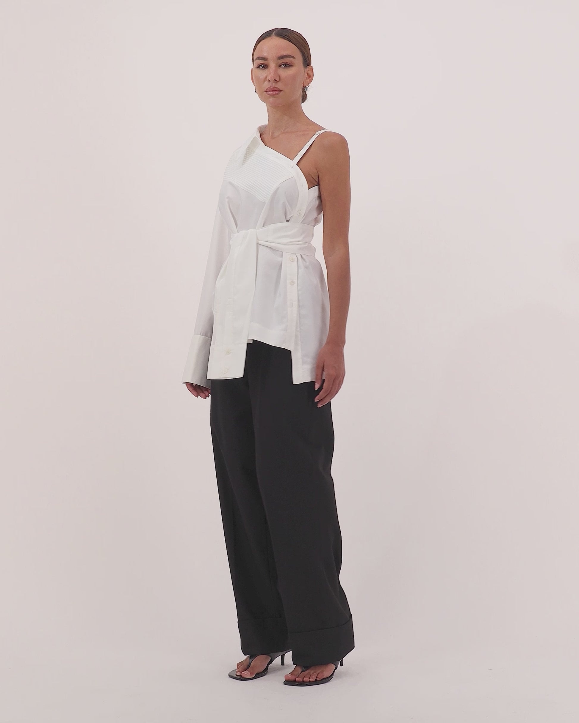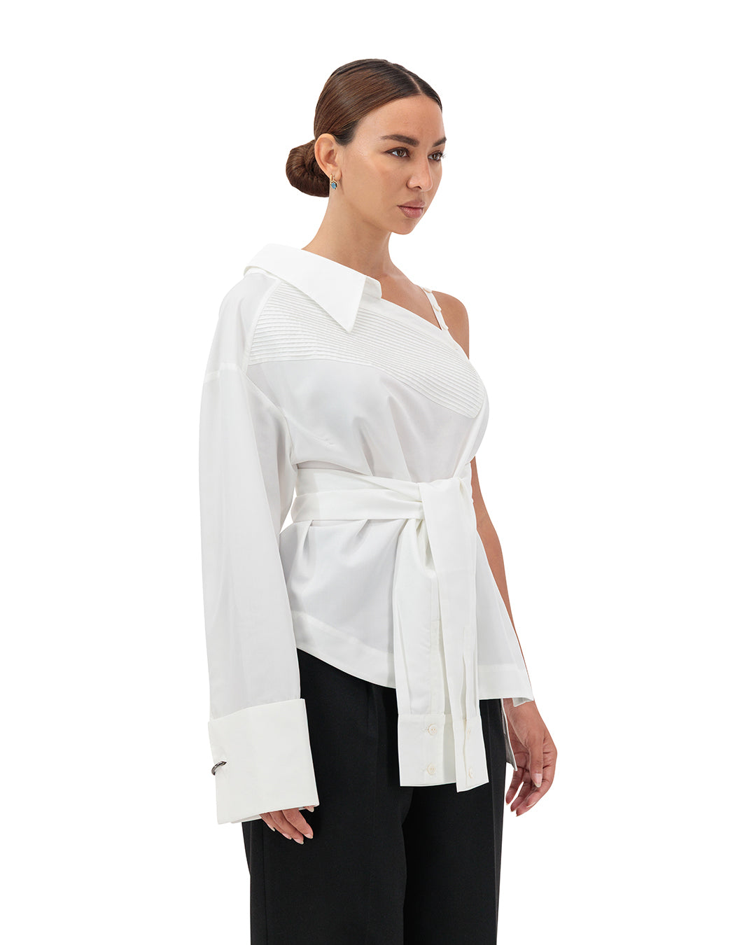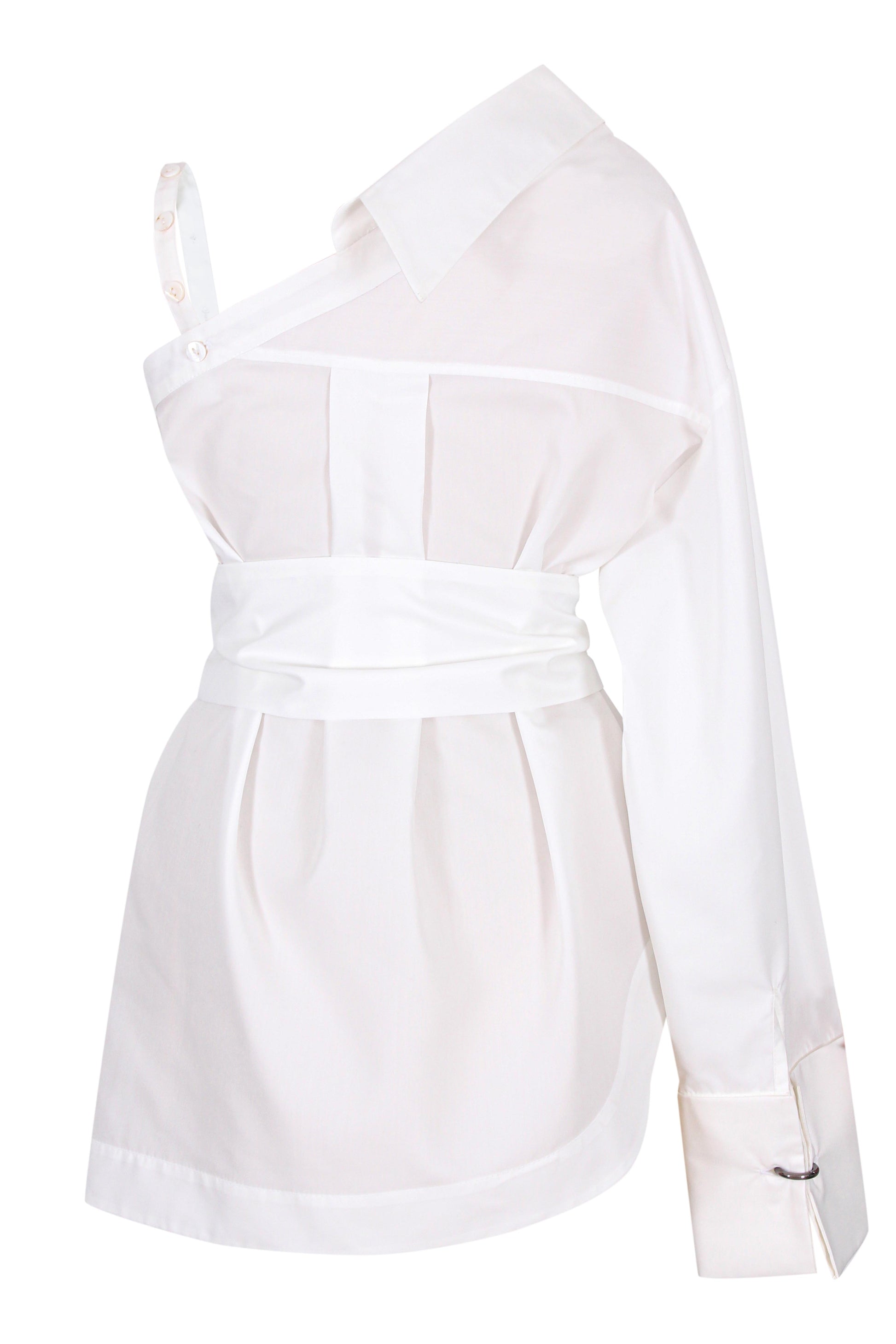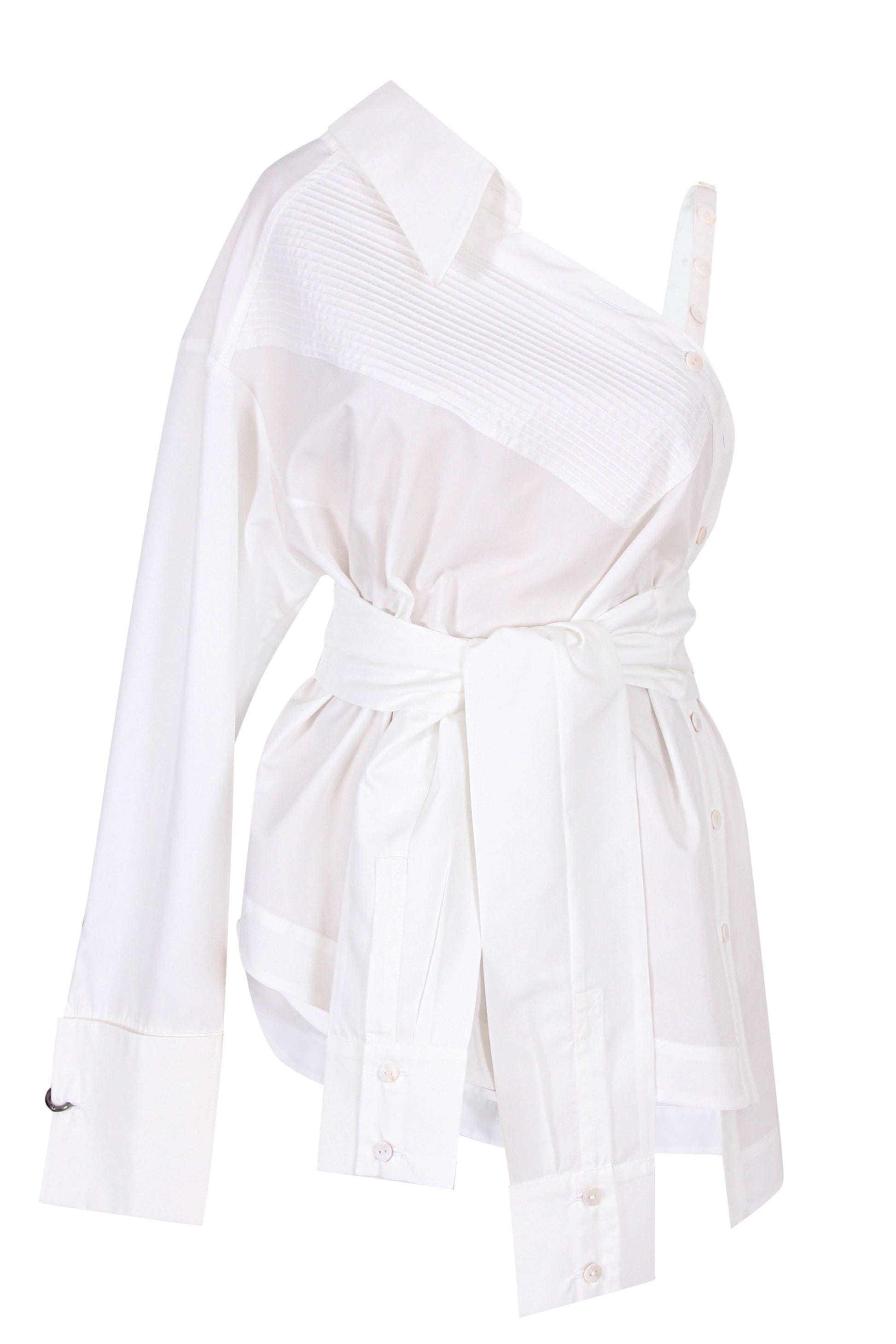 Indulge in the luxury of our Deconstructed One Sleeve Shirt. This hand-crafted piece features a unique one shoulder design, tuxedo pleats on a white bib, an asymmetrical hemline, and a side button closure for an effortlessly chic look. It also features a mock sleeve belt .Made from 100% Egyptian cotton , this shirt boasts an exclusive quality that will be timeless for any wardrobe.