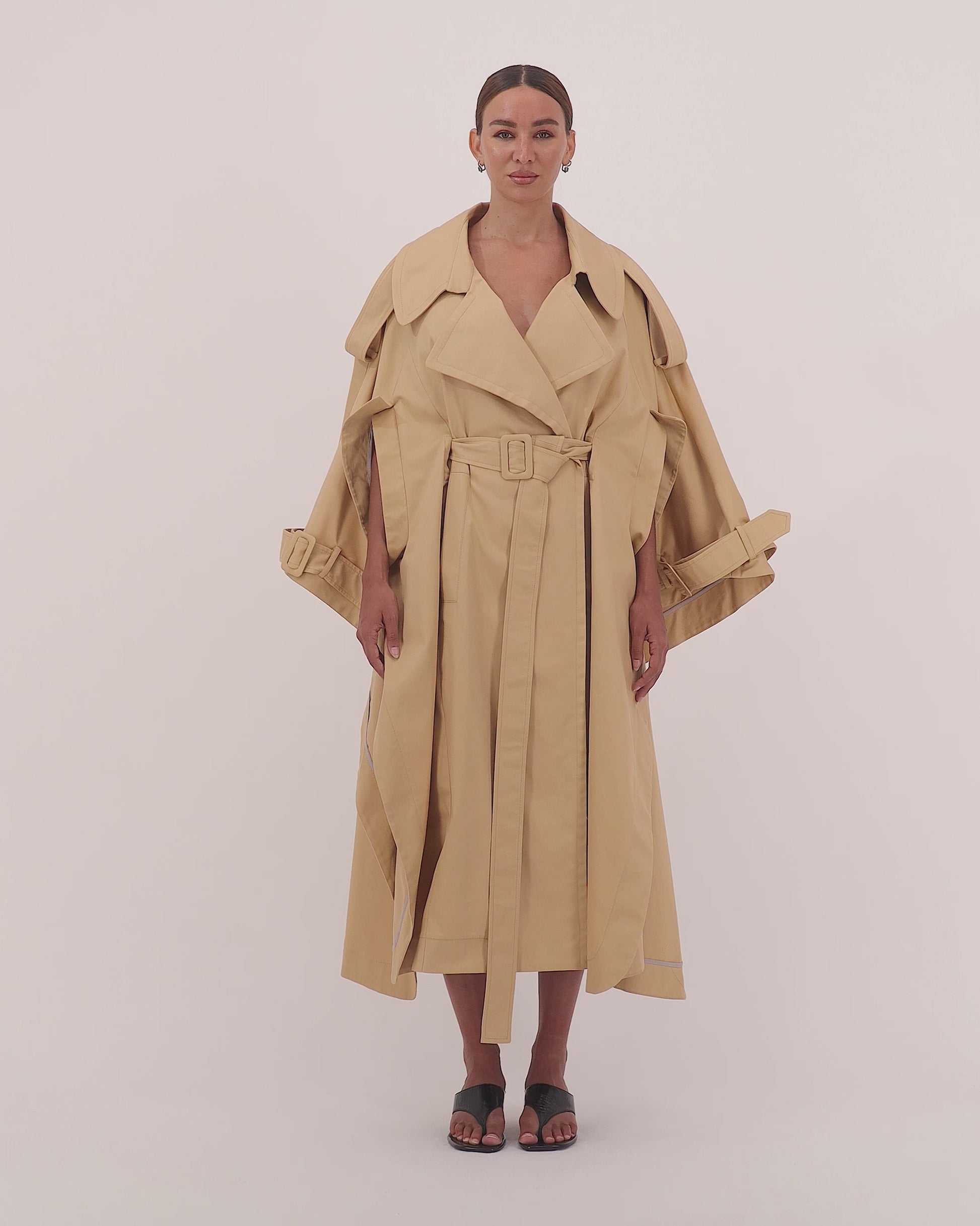 Reimagining the trench coat has always been a core aesthetic of the Dina Shaker brand. This piece dissects the anatomy of the classic trench and merges it with the timeless spirit of the ancient Egyptian cape. The result is a sculptural yet fluid silhouette—designed as a modern armour for today’s woman.