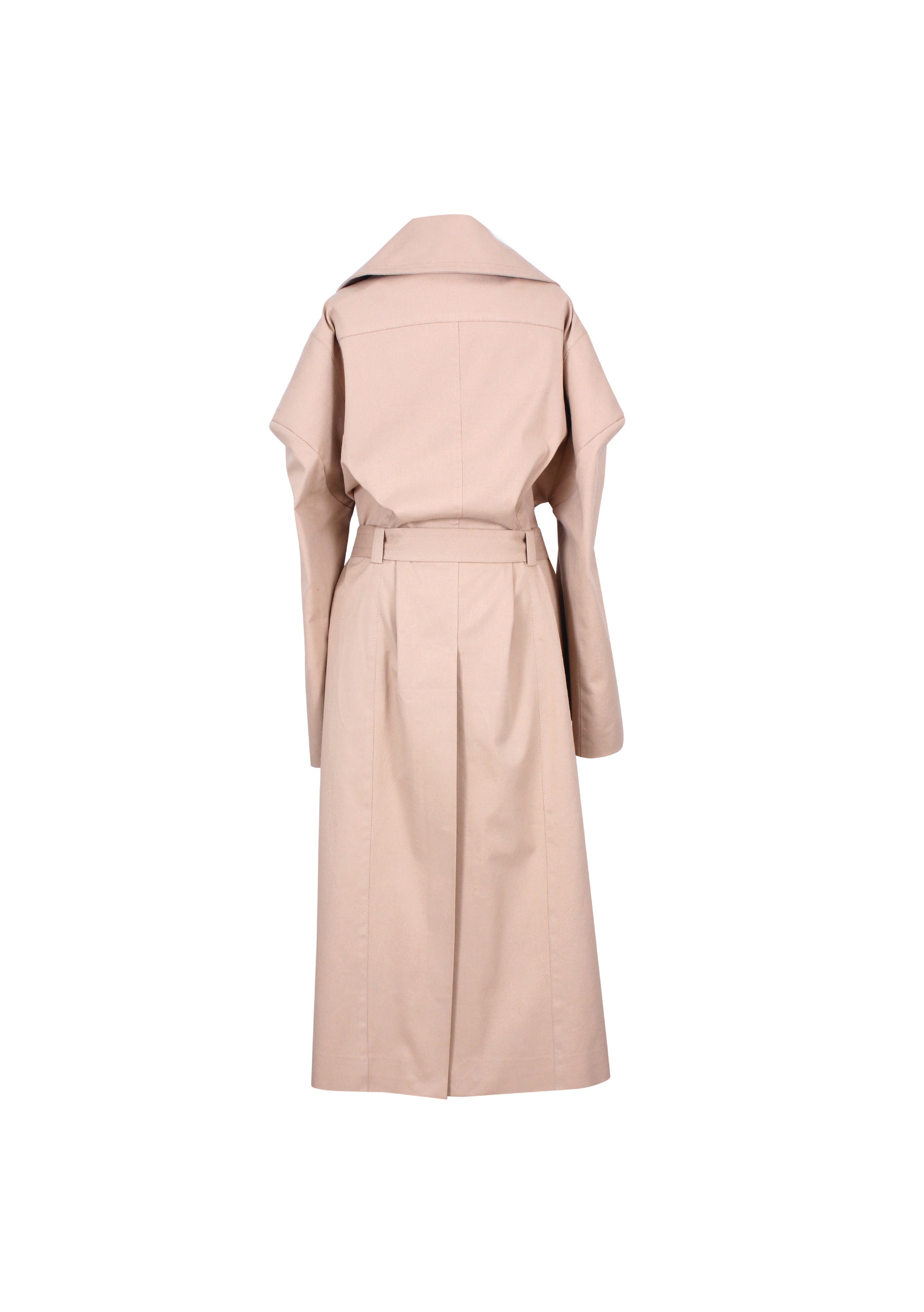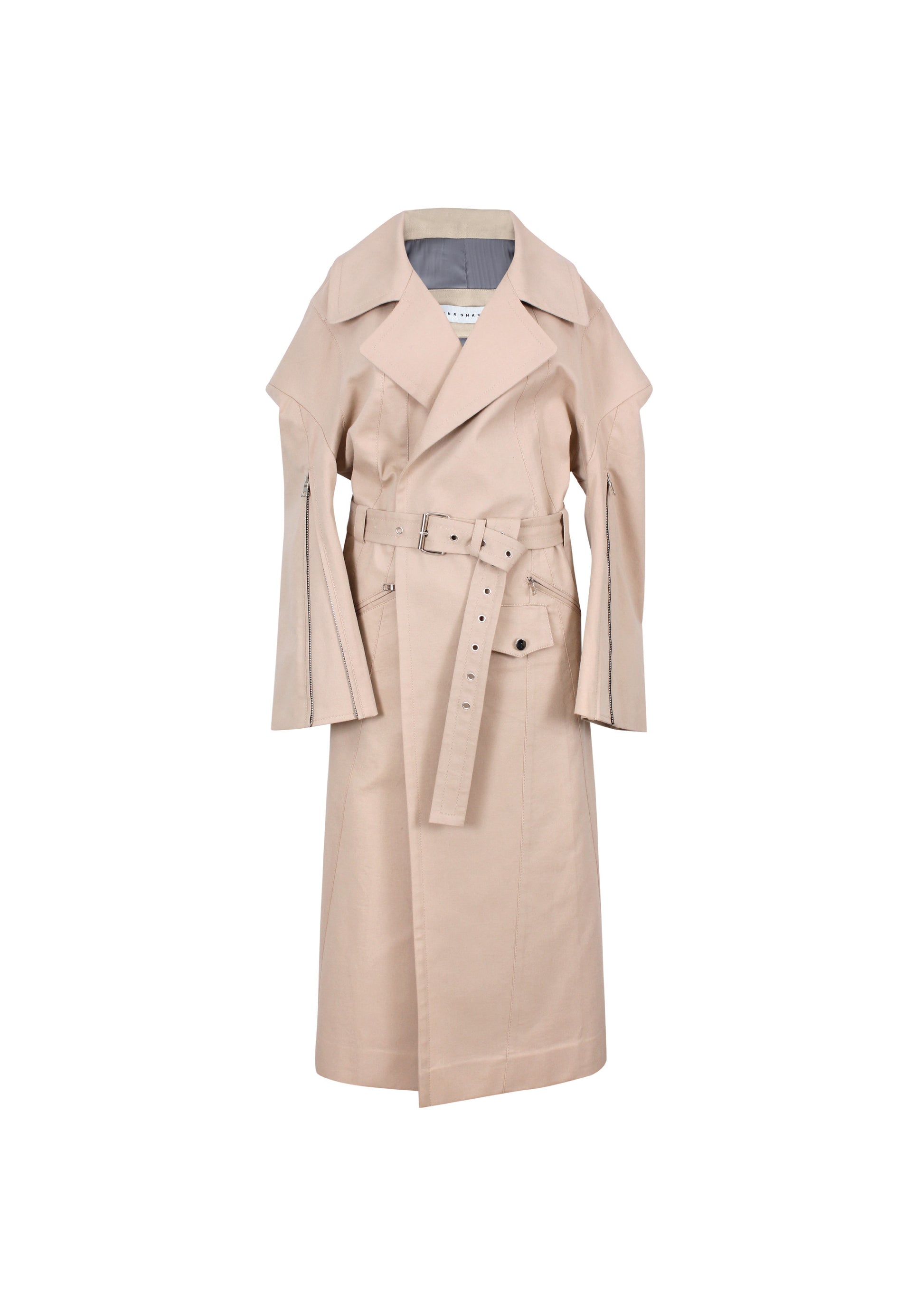 Crafted from heavy cotton twill for a structured feel, this unisex trench combines the classic trench coat with the edgy aesthetic of leather biker jackets. Its extra oversized fit features exaggerated double-shoulder detail, while polished metal hardware, including sleeve zippers, adds volume and width to the sleeves. The paneled construction highlights craftsmanship, with a trench lapel and wide open collar for a relaxed, off-shoulder look. A polished metallic eyelet belt with a minimal metal buckle cinches the waist, adding definition to the silhouette. Designed with a wrap-style closure, the trench includes side-zippered inclined pockets, a small flap pocket, and a long back slit for ease of movement and accessibility. Falling to ankle length, this bold design reimagines timeless outerwear. Made in Egypt from 100% cotton.