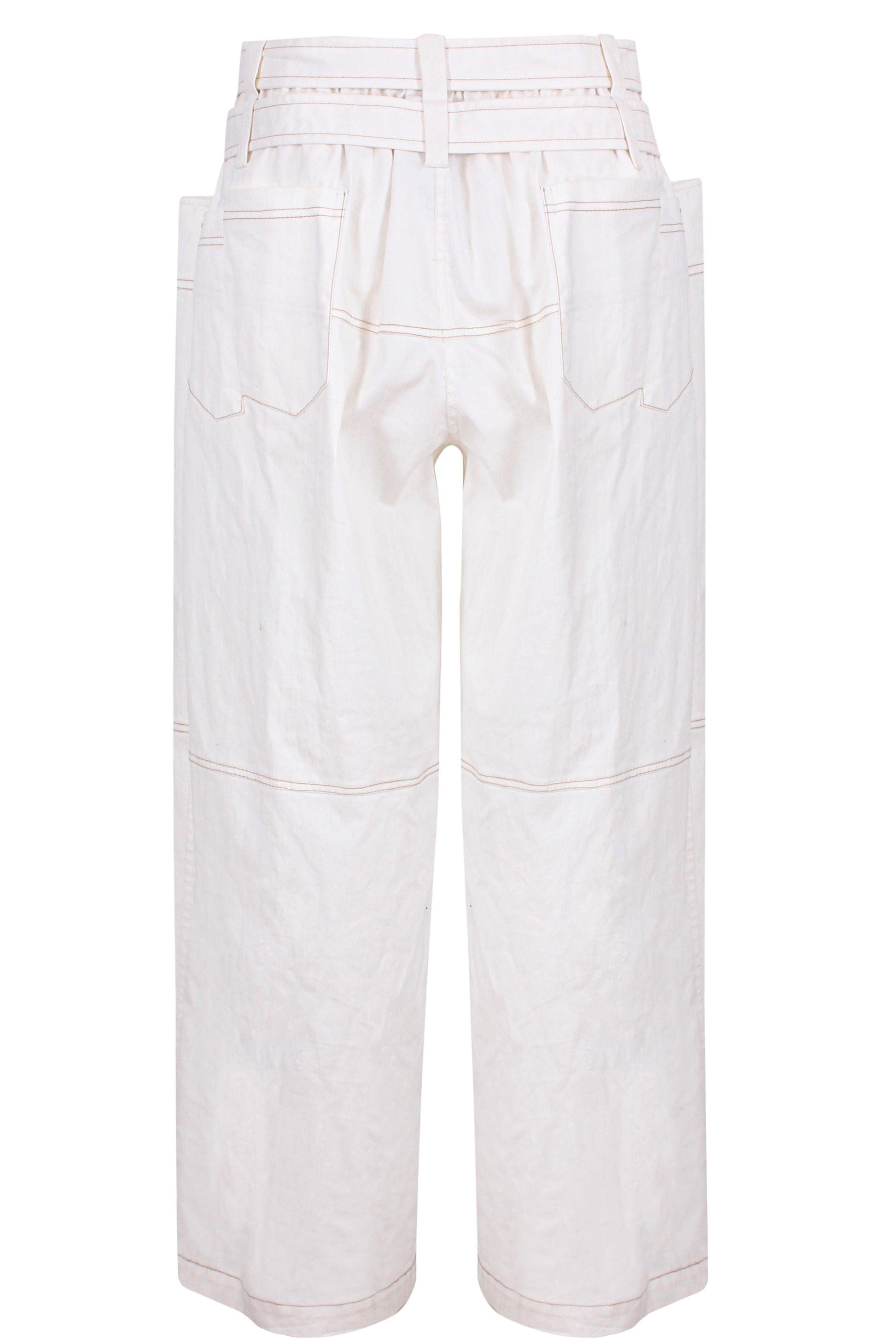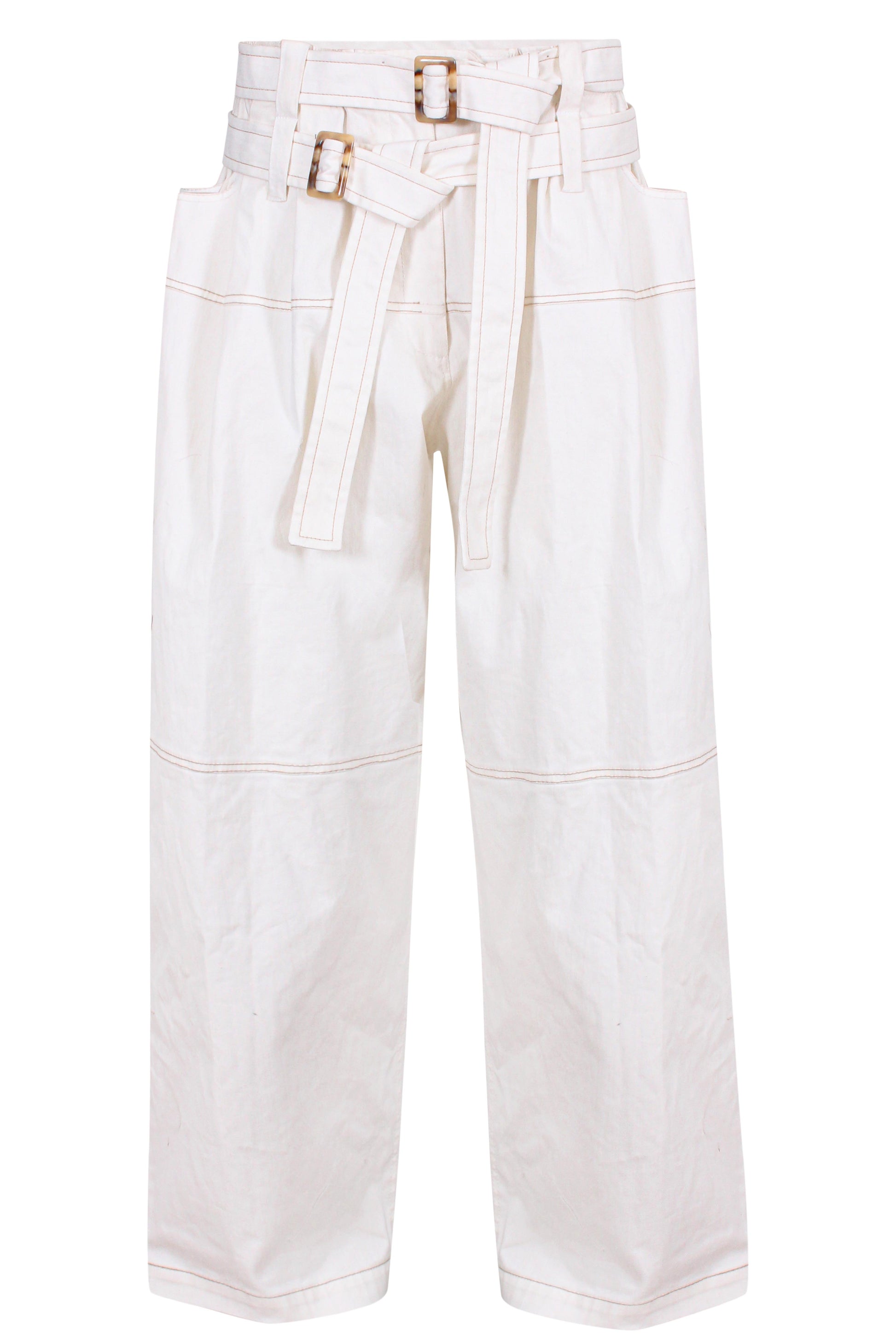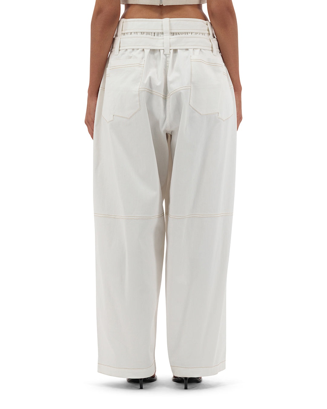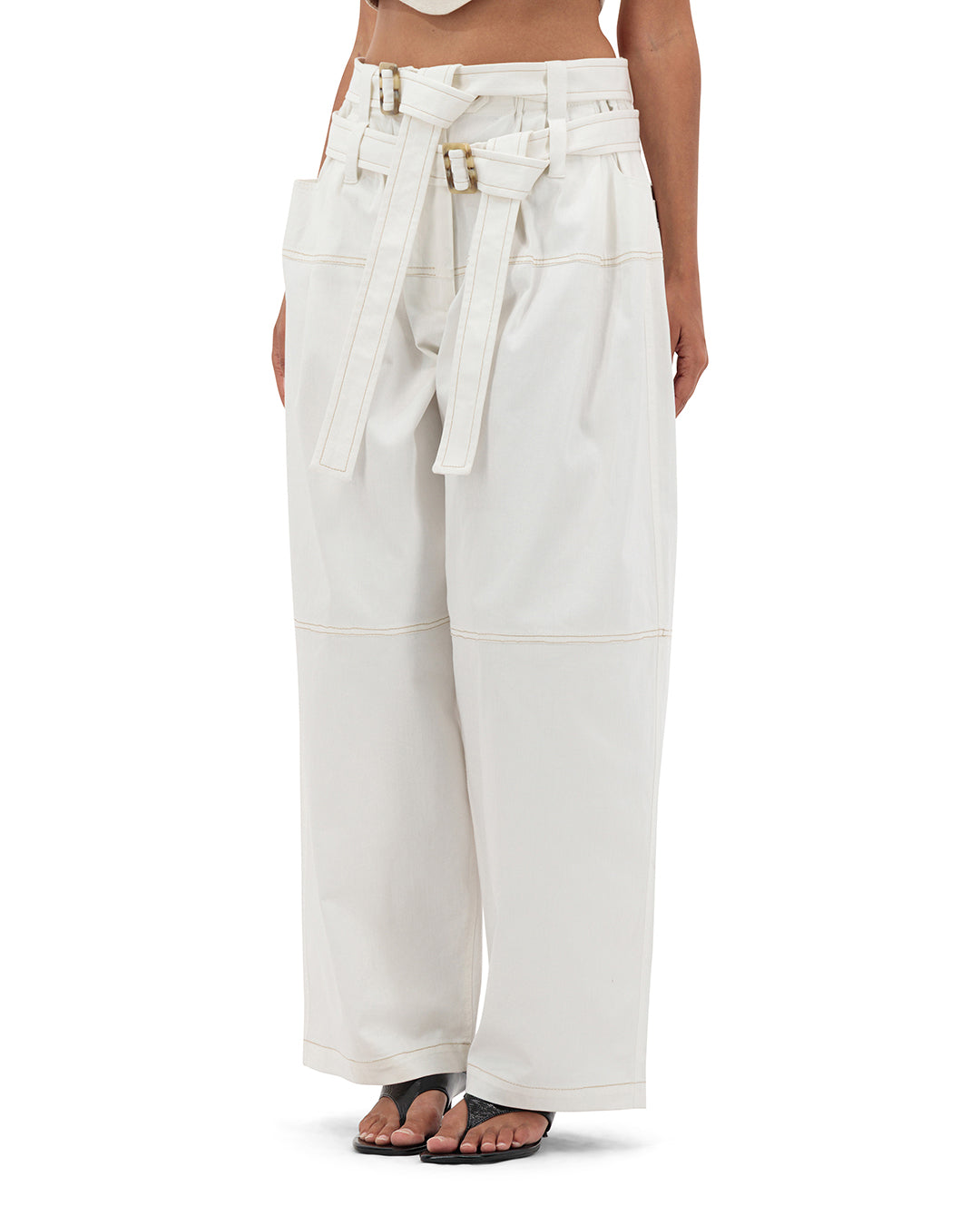 A column architectural silhouette with cocoon-like volume through the hips and thighs, held in balance by double military-inspired belts at the waist to control volume.