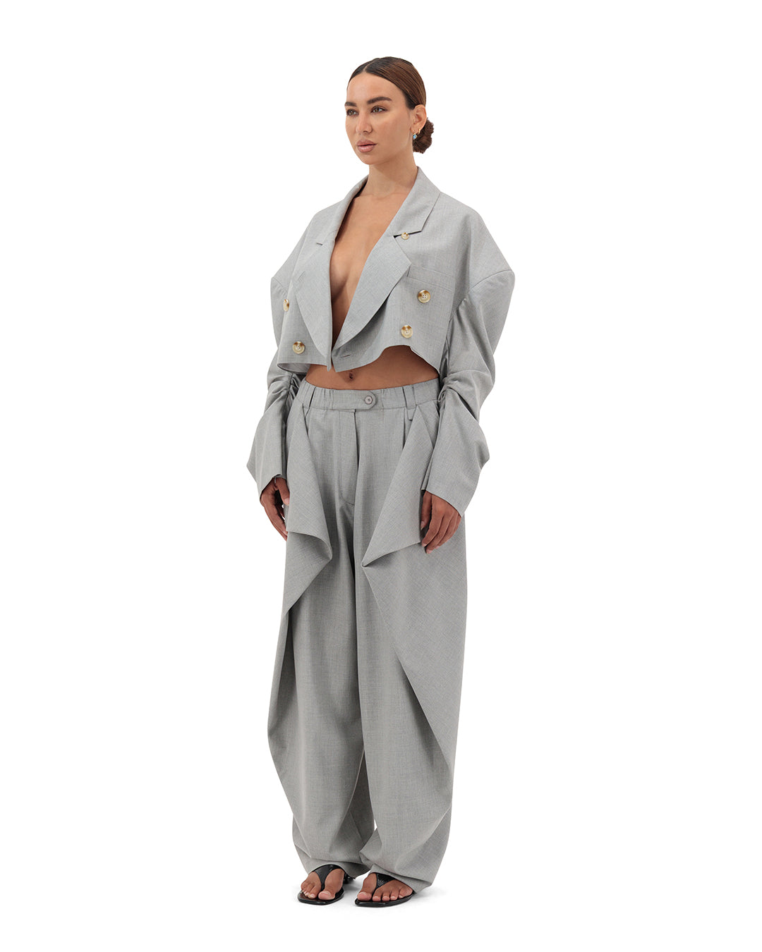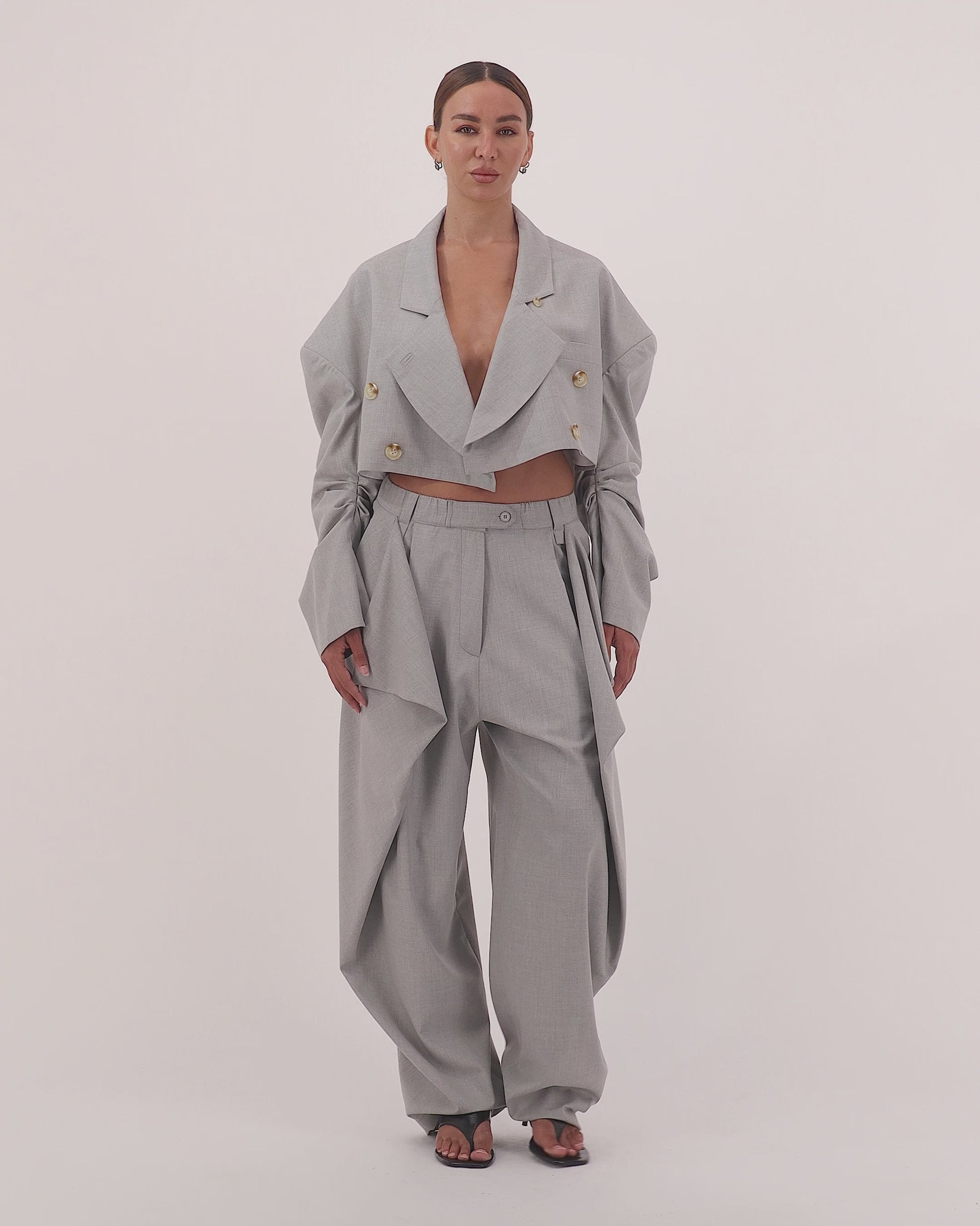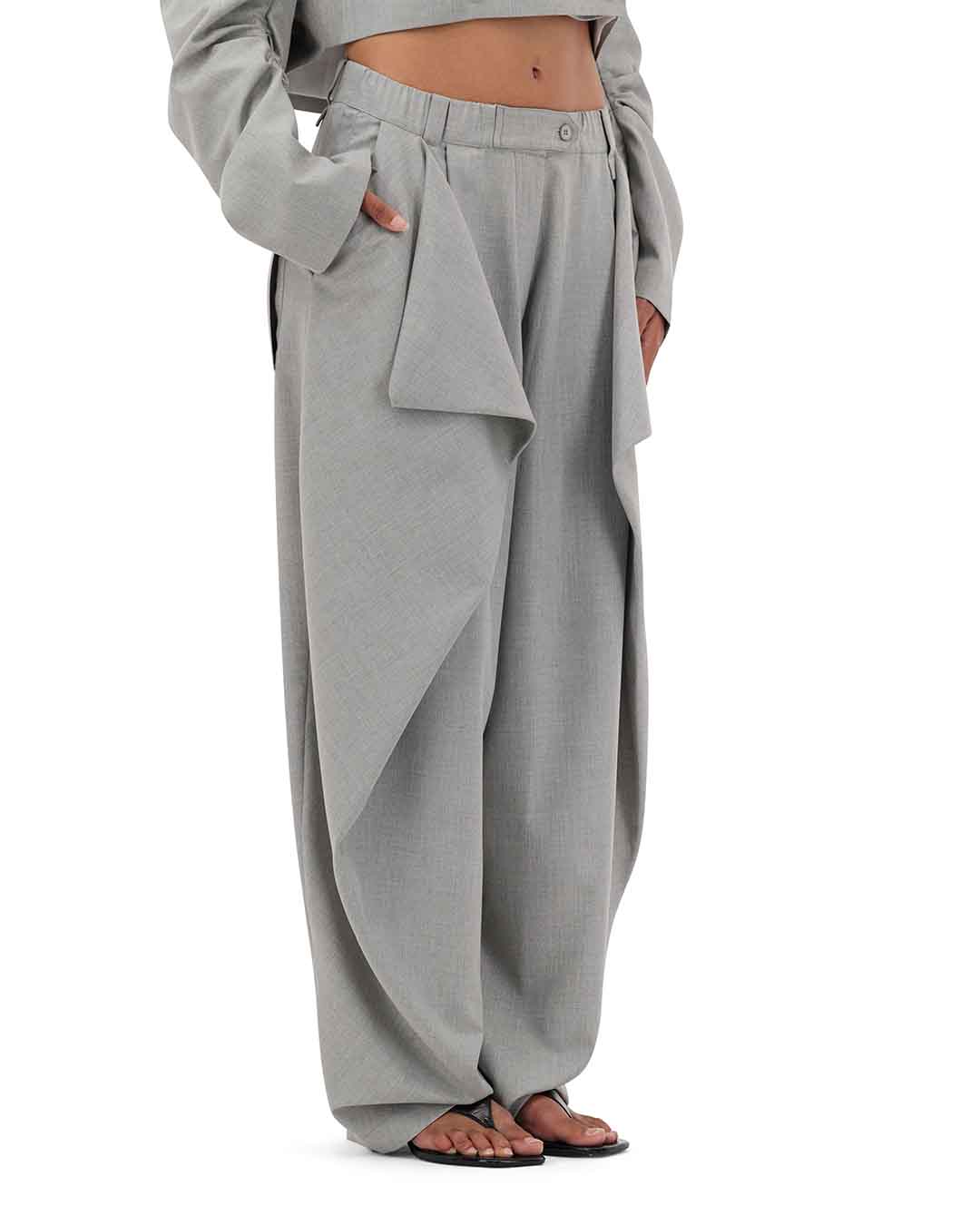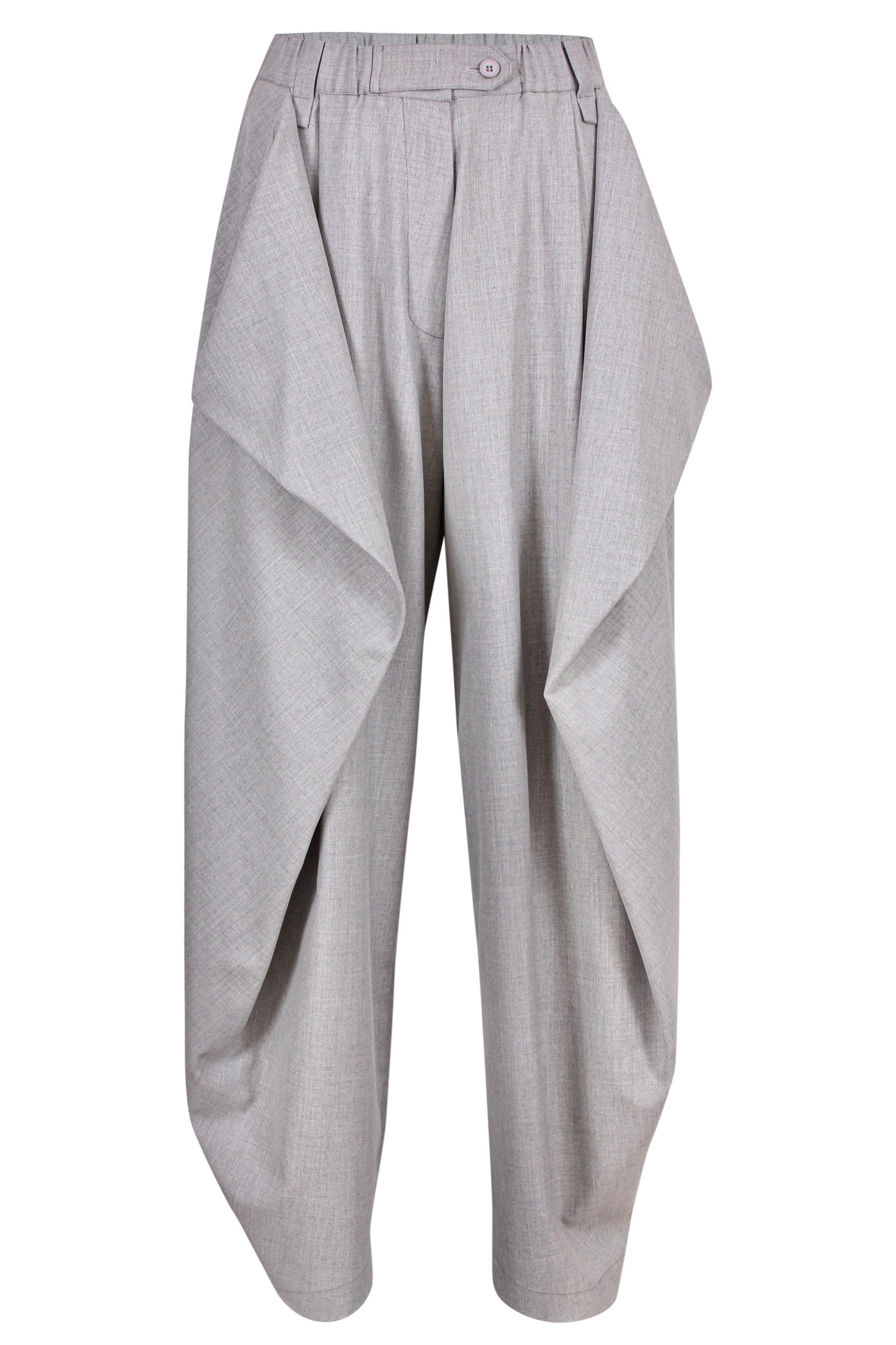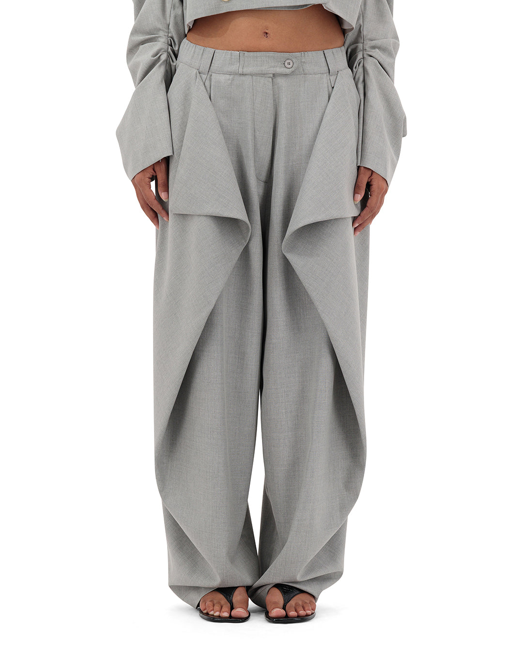 These sculptural pants embody a cocoon-like form, with generous side volume and a fluid front drape that introduces movement within structure. Inspired by modern architectural forms, the design balances flow and form—creating a statement silhouette that feels both strong and effortless. A wearable expression of shape and motion, crafted with purpose and quiet presence.