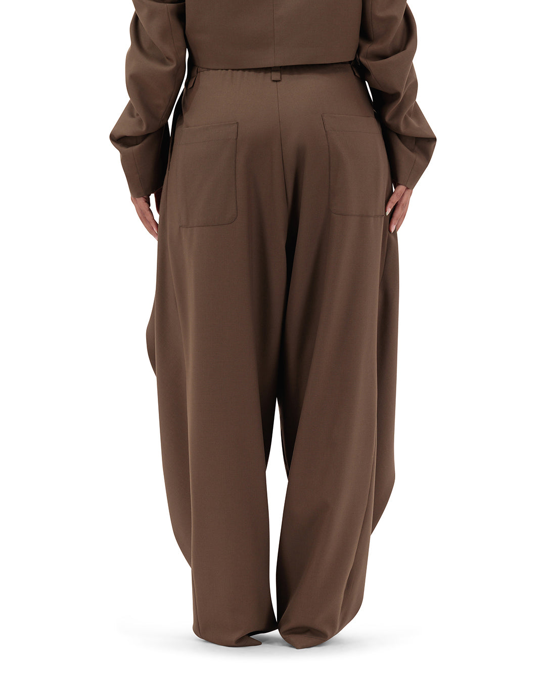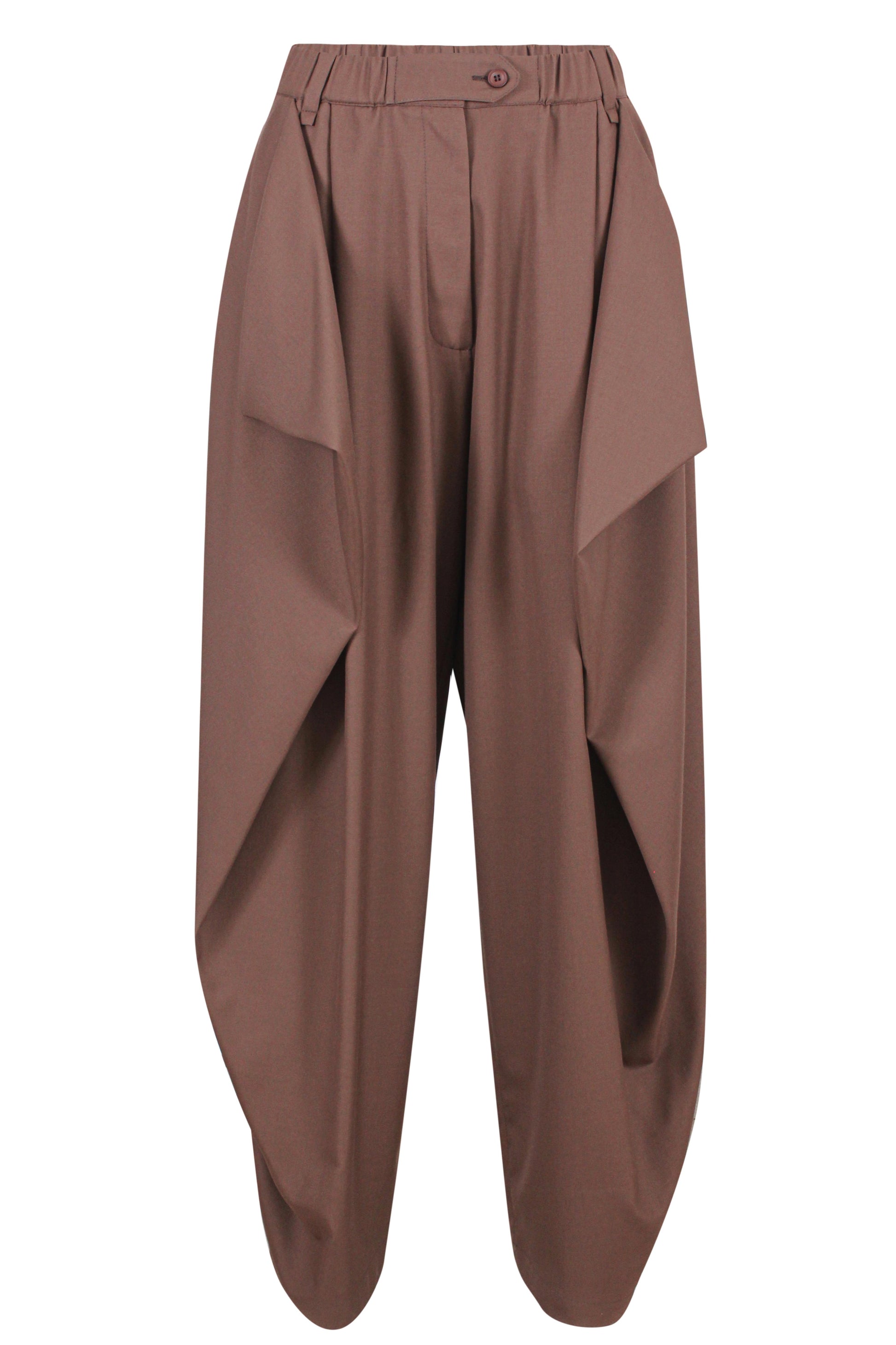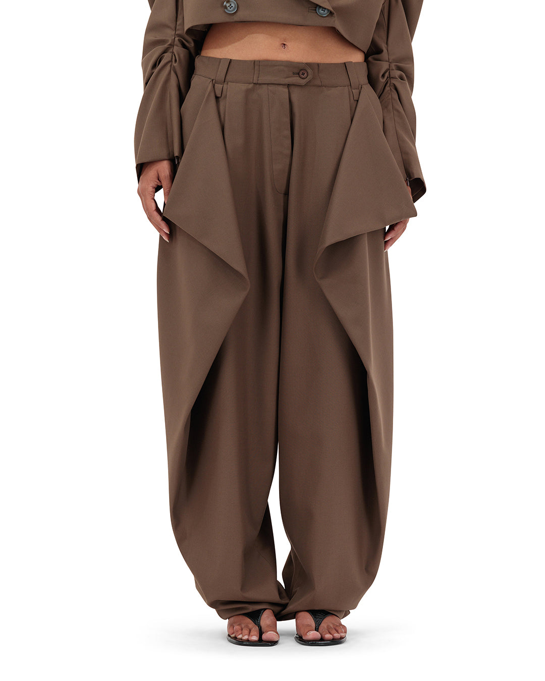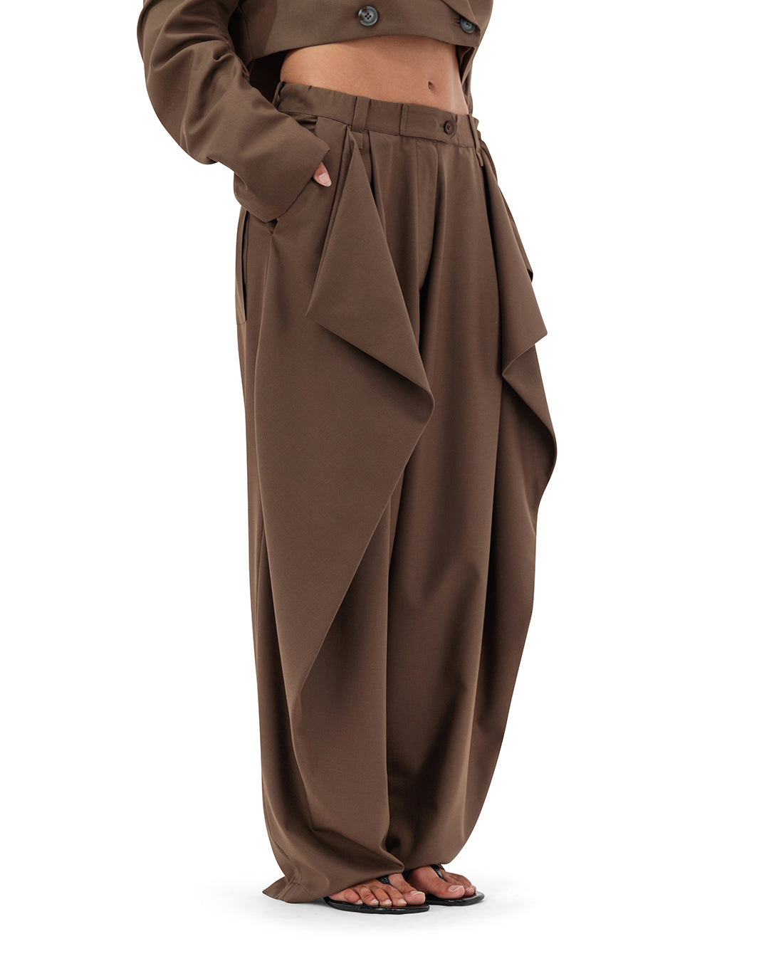 These sculptural pants embody a cocoon-like form, with generous side volume and a fluid front drape that introduces movement within structure. Inspired by modern architectural forms, the design balances flow and form—creating a statement silhouette that feels both strong and effortless. A wearable expression of shape and motion, crafted with purpose and quiet presence.