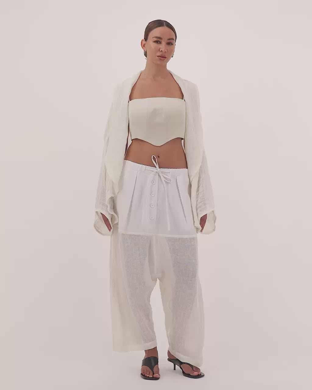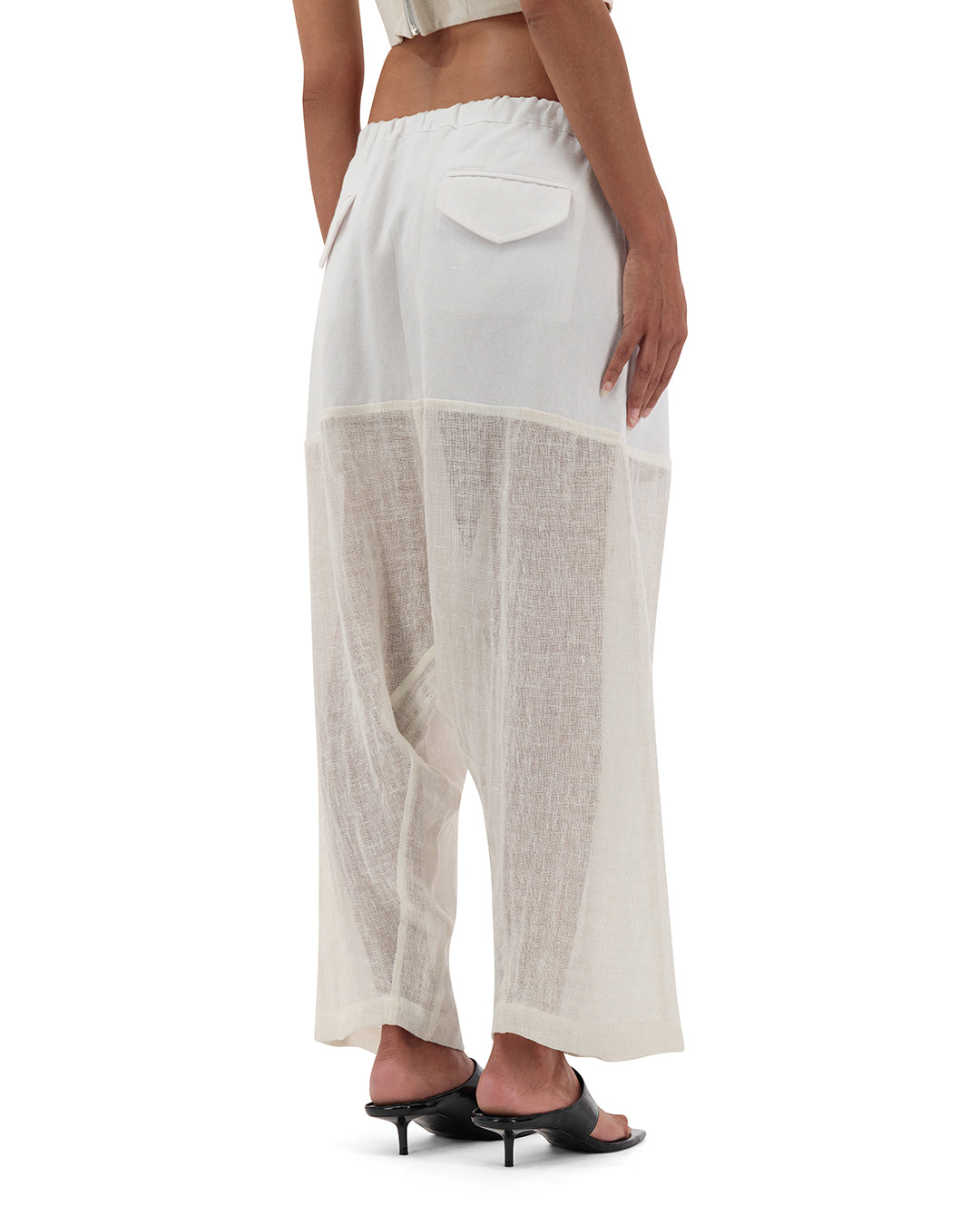 Our iconic Drop Crotch Linen Pants, featured first time in our exclusive SS23 collection, offering a luxurious comfort and practical silhouette. Made from soft washed mesh linen, these pants feature an oversized fluid fit, elasticated waistband with hanging drawstrings, and a revealed button closure. Perfect for your summer resort trip, with short cotton voile lining for added lightness and transparency.