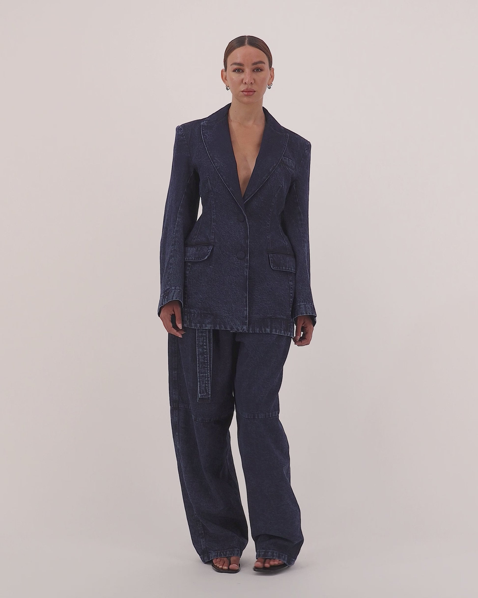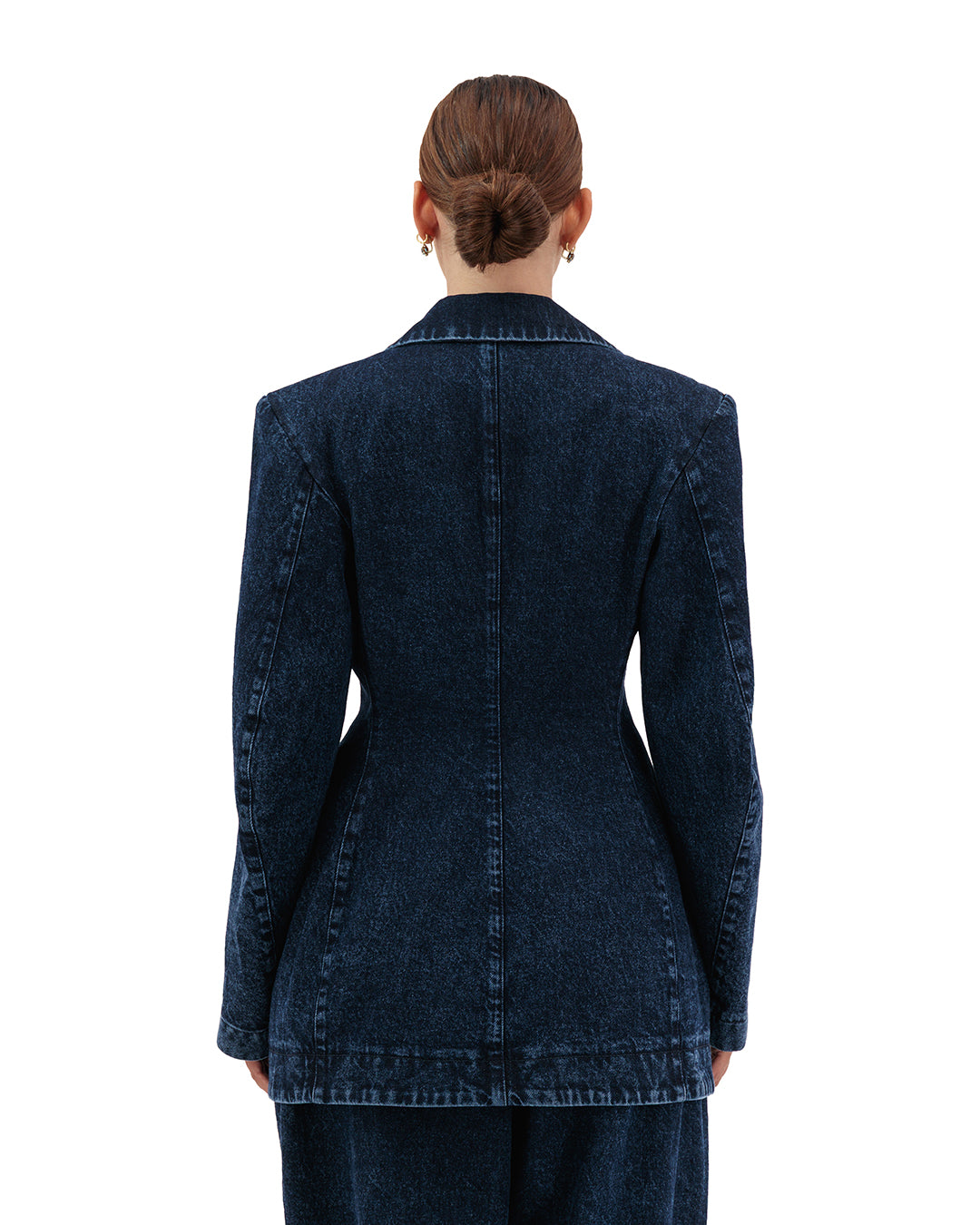 This sculptural jacket features engineered sleeve panels with a subtle twisted curve—bringing form and movement into perfect balance. Cut in a sculpted hourglass silhouette with broad, padded shoulders, it gently contours the body and falls just below the hip.