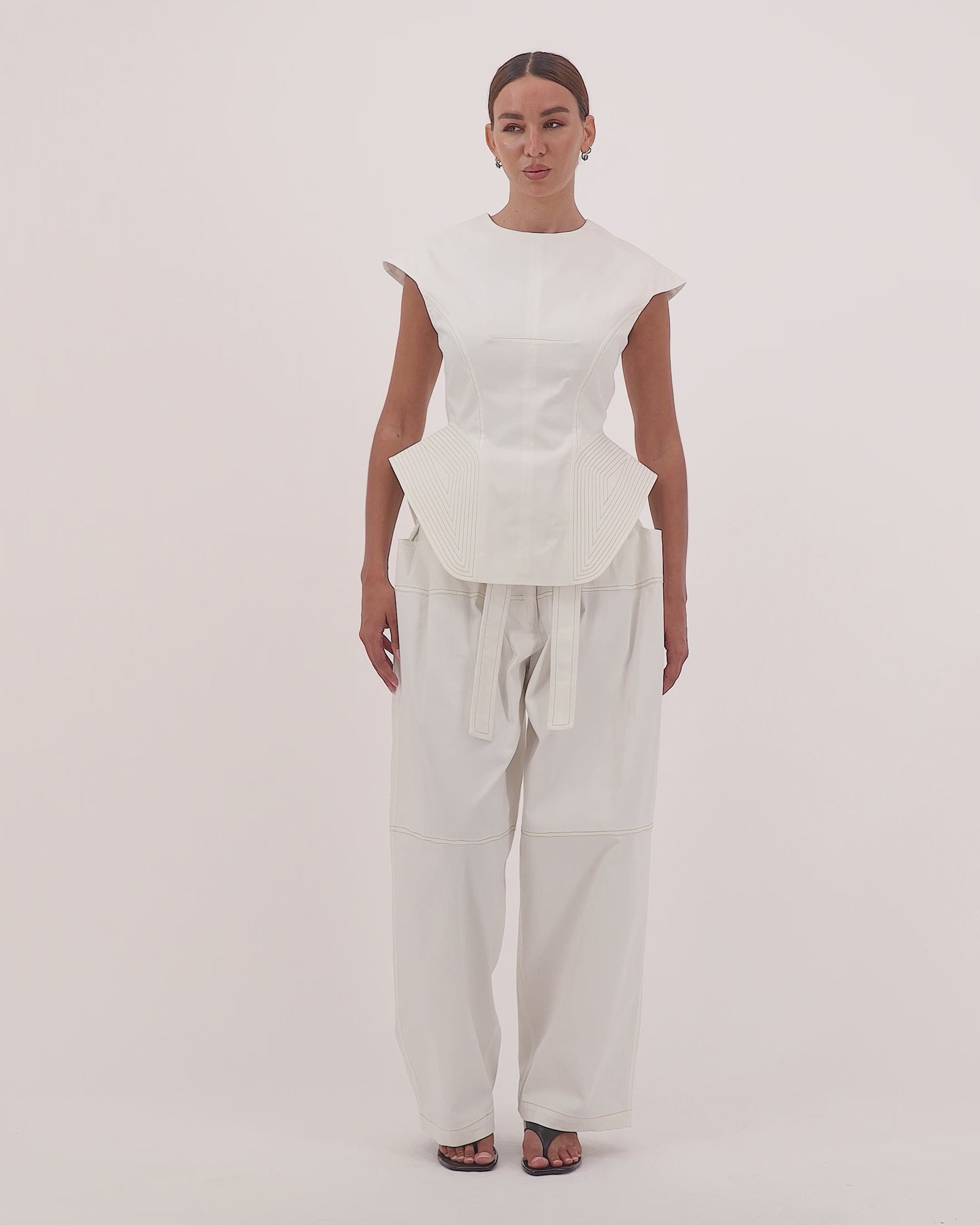 Exquisitely crafted from 100% cotton gabardine twill, this iconic sleeveless top is sculpted in a distinctive hourglass silhouette. If features a sculpted multi-stitch peplum finished with a scalloped hemline. Full back exposed metal zipper add a subtle nod to strength and structure.