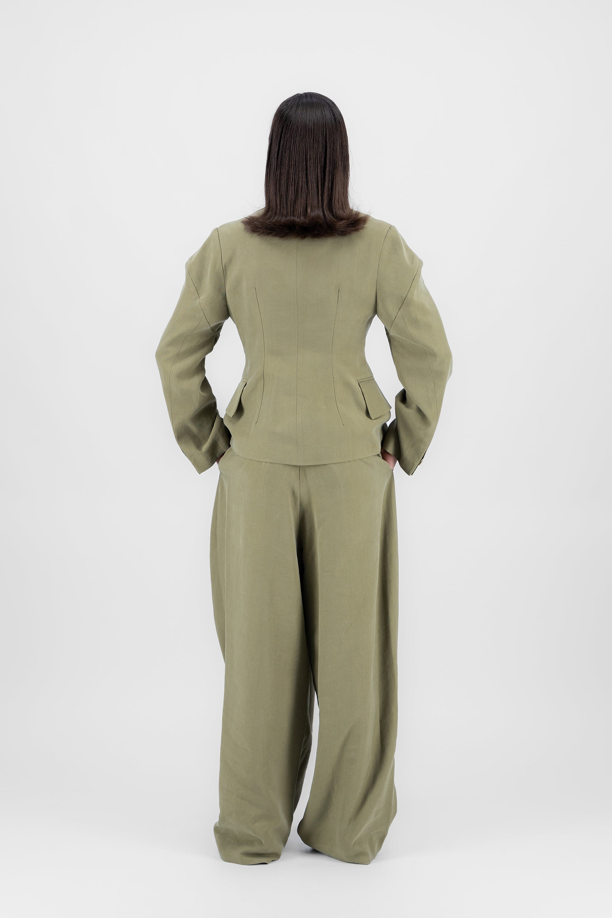 The Hybrid Tailored Jacket is a signature Dina Shaker silhouette — engineered with an hourglass cut that defines the waist while maintaining ease and strength in movement. Crafted in tencel-linen twill, it offers a soft yet structured hand, ideal for year-round wear. Our reinterpretation of classic metal buttons ,irregular in shape and sculptural in form ,adds a distinctive, contemporary detail.