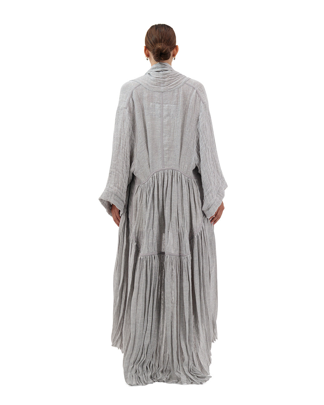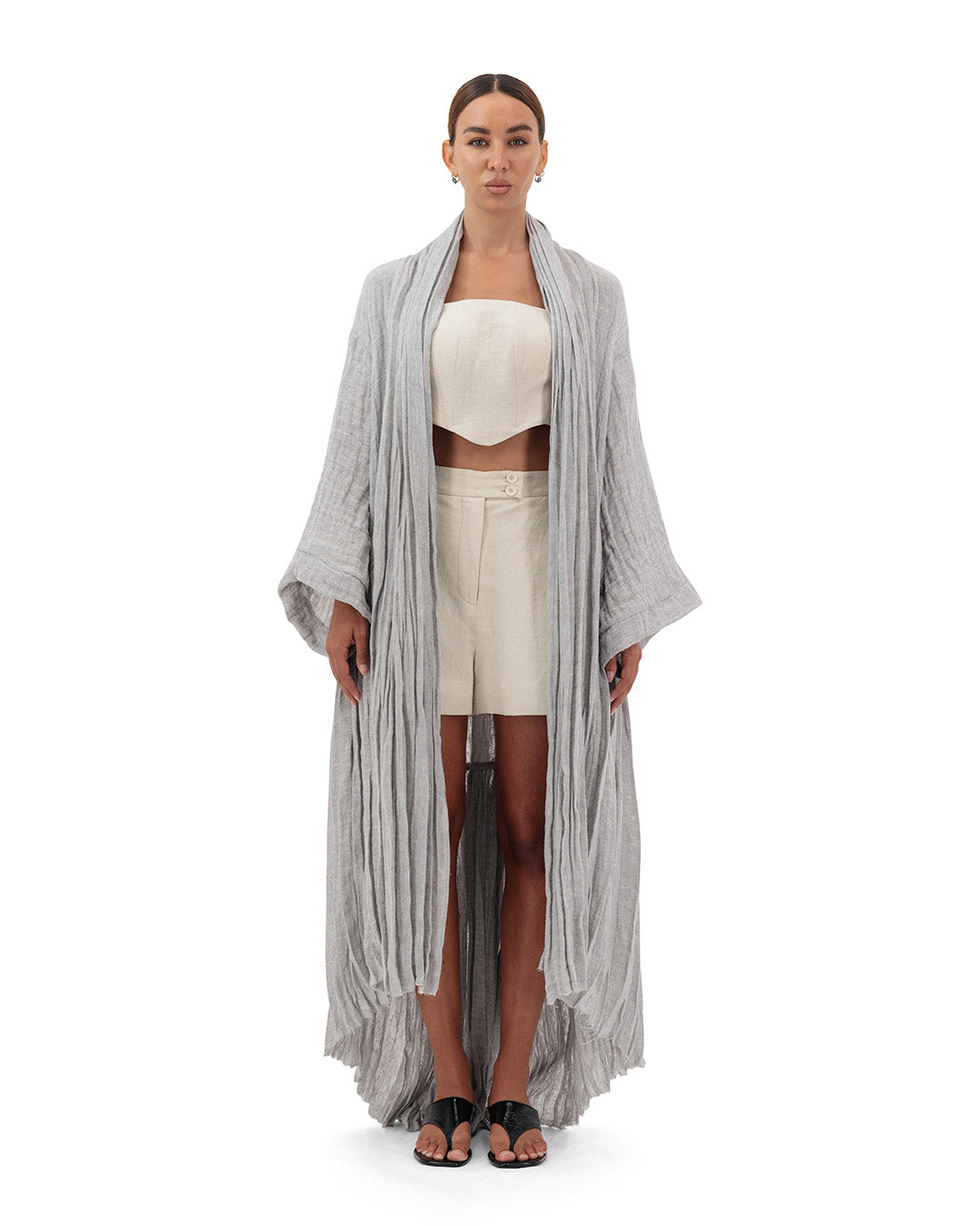 This Kimono is made to wear in the bustling city or as a resort look. It has a flattering flowy silhouette with seams piping detail. The Kimono is cut from mesh linen in an oversized fitting.