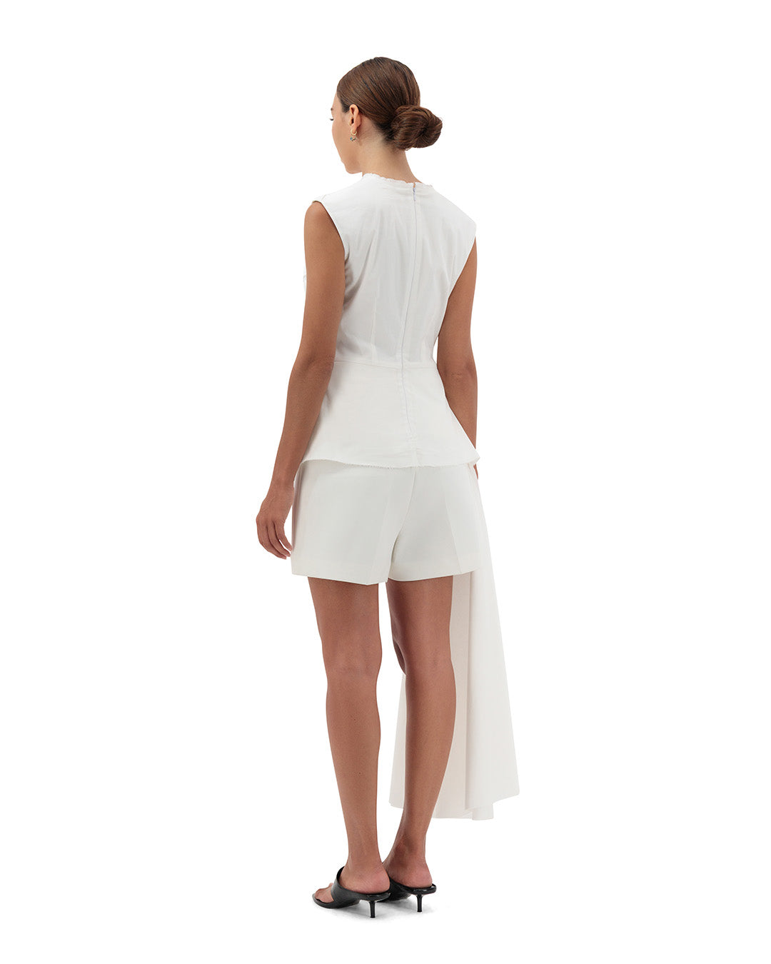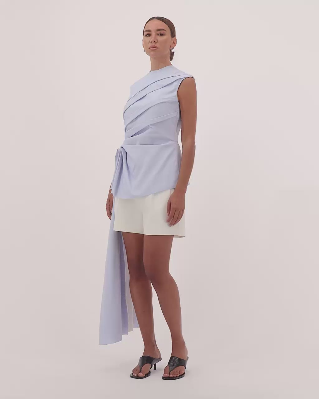 Elevate your summer wardrobe with our side sculpted sleeveless top. Made from slightly stretch coton poplin (96% cotton /4% elastine) this top features a structured side pleated extended flap left with a raw edge . The minimal round neckline and back concealed zip add a touch of rawness. Pair it with our tailored linen shorts for an exclusive summer resort look.