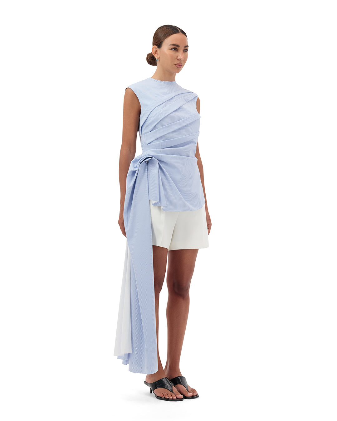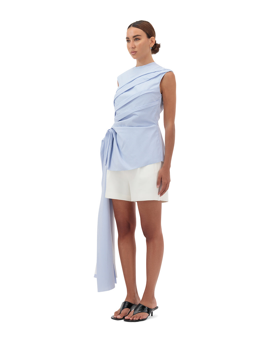 Elevate your summer wardrobe with our side sculpted sleeveless top. Made from slightly stretch coton poplin (96% cotton /4% elastine) this top features a structured side pleated extended flap left with a raw edge . The minimal round neckline and back concealed zip add a touch of rawness. Pair it with our tailored linen shorts for an exclusive summer resort look.
